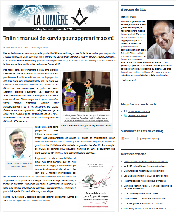 Pas facile d’entrer en franc-maçonnerie, pas facile d’être apprenti maçon, pas facile de se motiver pour ne pas fuir à toutes jambes. Il fallait donc bien un « Manuel de survie pour Apprenti maçon voulant démissionner». C’est le frère Franck Fouqueray qui s’est dévoué pour l’écrire (il est membre de la GLMMM). Son ouvrage sera le 5 décembre dans les librairies parisiennes Détrad et JB.